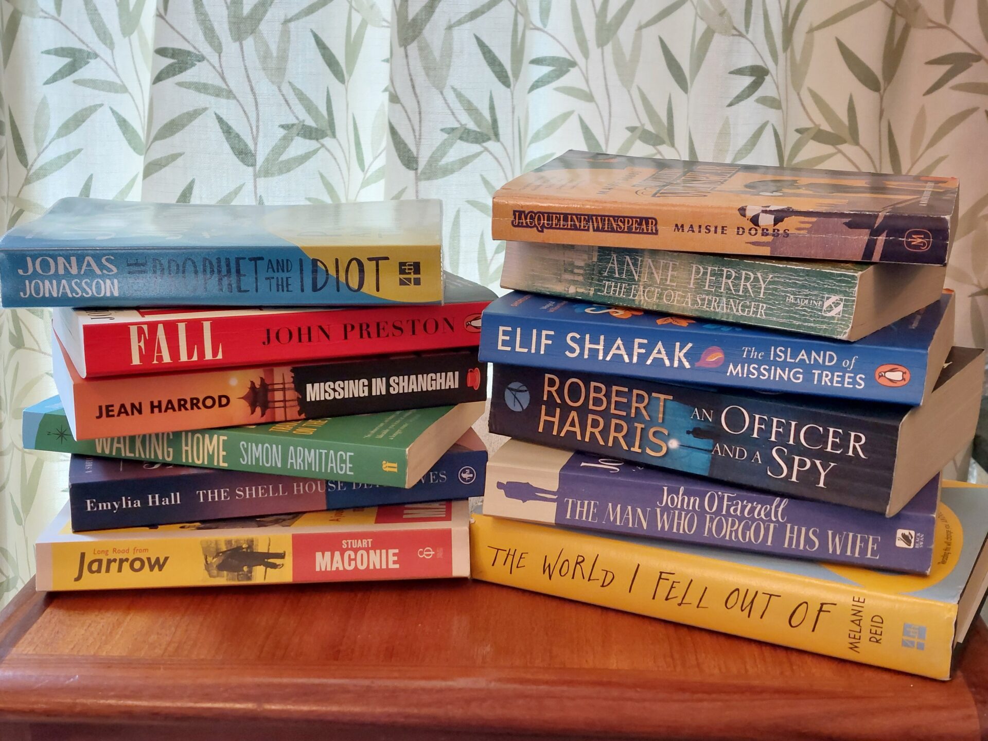 2 piles of 5 books each on a table